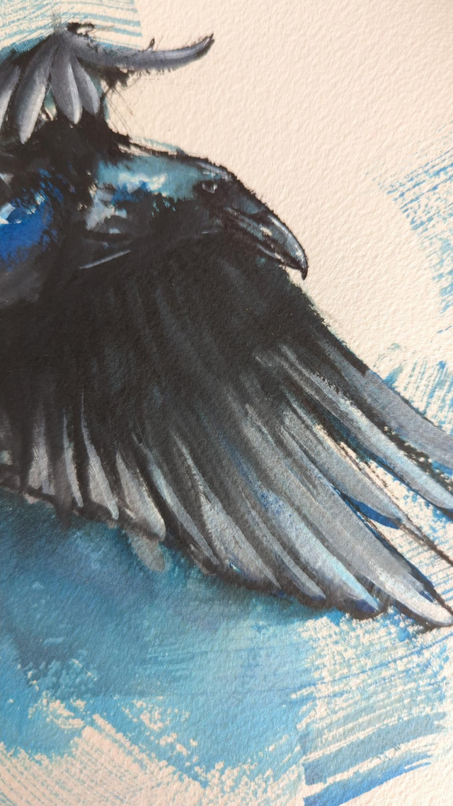Cette œuvre originale capture le mouvement dynamique et la texture plumeuse d'un corbeau en plein envol. Réalisée à la main sur du papier Arches, référence absolue des artistes pour sa qualité et son grain exceptionnel, cette pièce joue sur les contrastes entre le noir profond du fusain et des éclats de bleu azur.