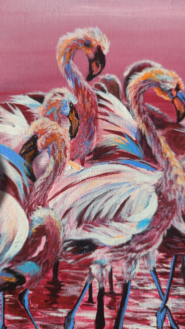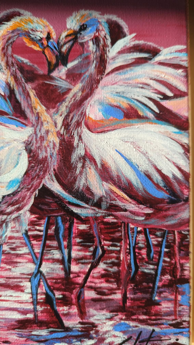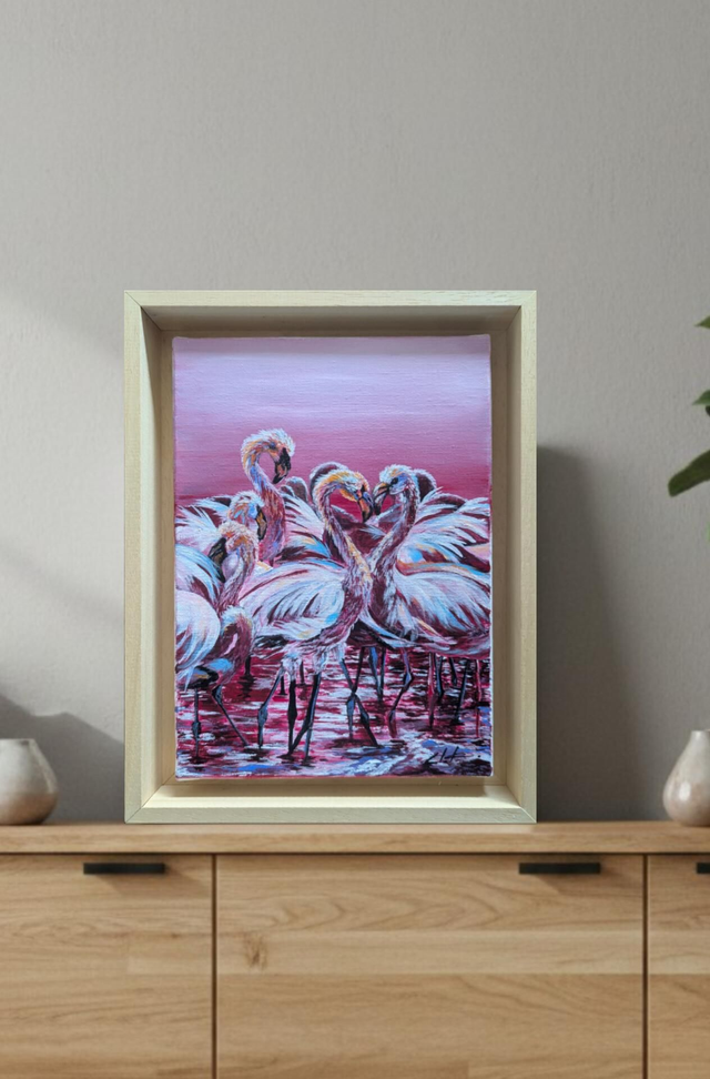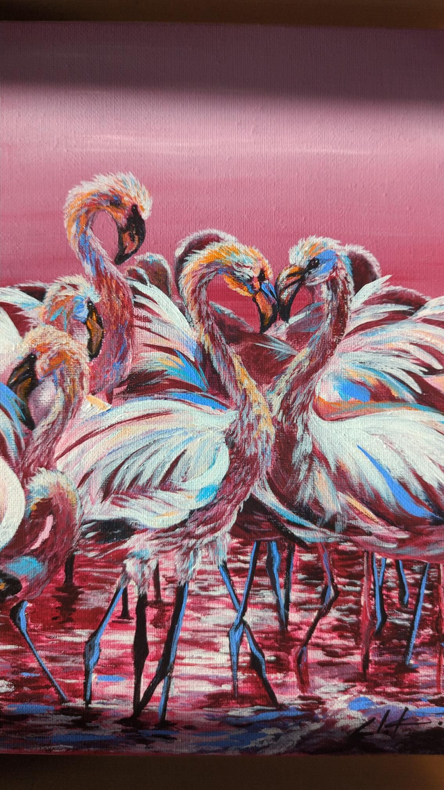 "La Vie en Rose" capte l'essence de la sérénité. Le contraste entre le rose vif de l'oiseau et le fond travaillé dans des tons plus clairs crée une luminosité naturelle qui s'adapte parfaitement à un salon, une chambre ou un espace bien-être. Chaque coup de pinceau est une invitation à la rêverie.