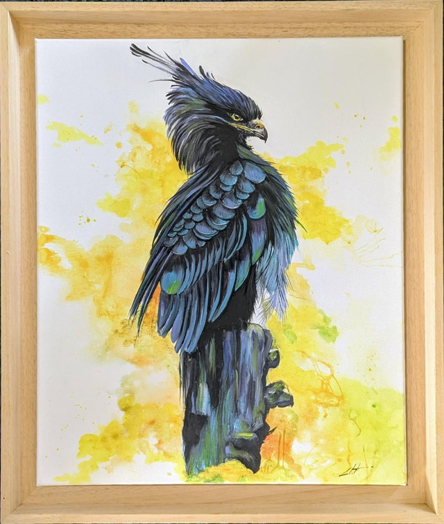 Cette pièce unique met en scène un rapace majestueux à la posture fière, dont le plumage aux reflets bleu nuit et émeraude contraste magnifiquement avec un fond d'un jaune solaire texturé. Le travail sur les plumes et la crête insuffle un dynamisme sauvage, tandis que l'arrière-plan abstrait apporte une luminosité exceptionnelle.